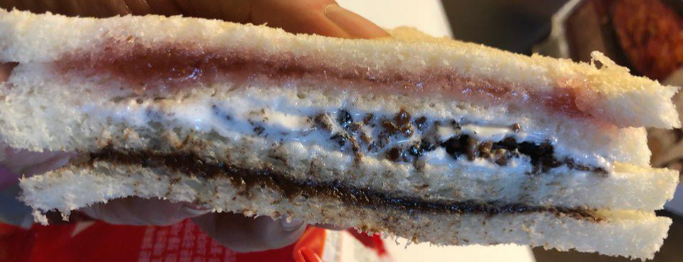 한 쪽에는 딸기잼, 중간에는 아이스크림 속 크림과 겉의 비스켓, 또 다른 쪽에는 초코잼이 있었습니다