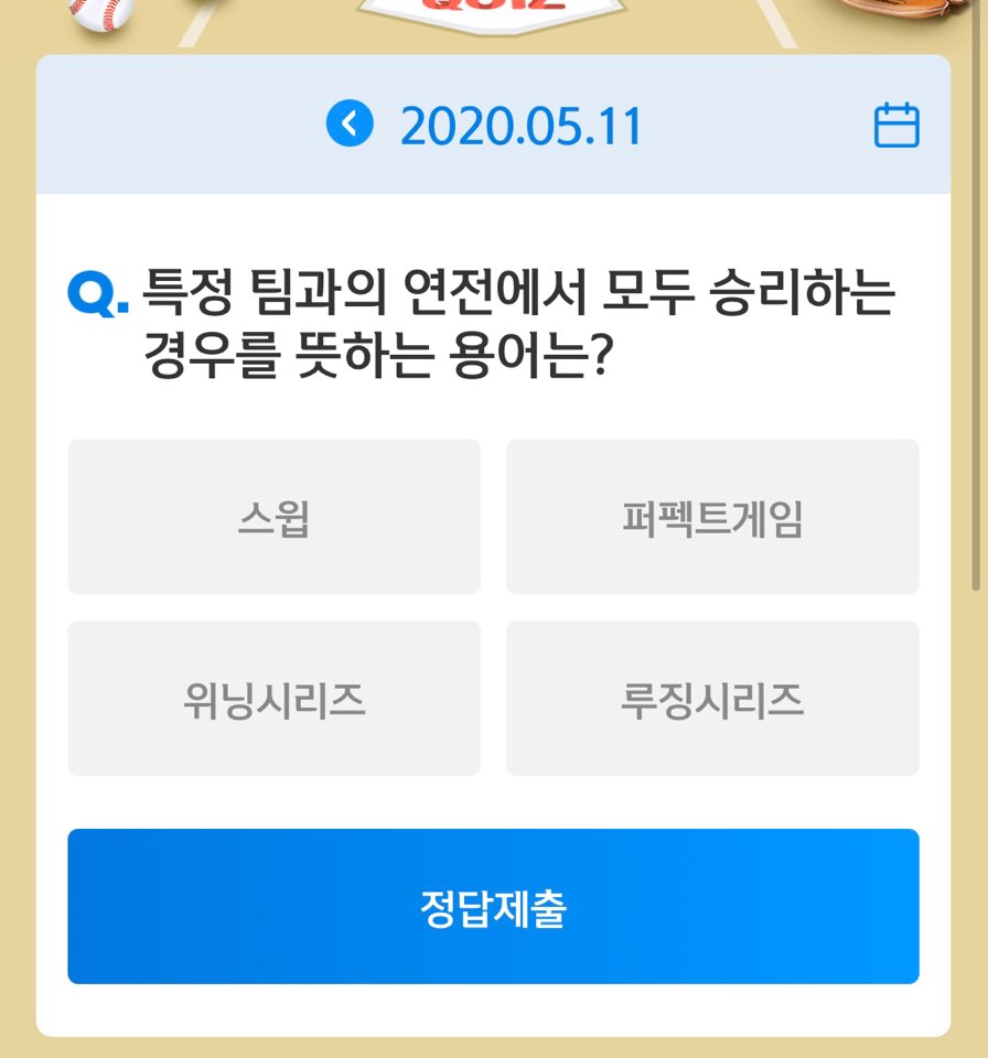 | [5/9(토) 쏠퀴즈] KBO리그 개막 기념으로 진행중인 [쏠야구 더블찬스] 이벤트는 몇일까지 진행될까요? (4) | 2020.05.09 |