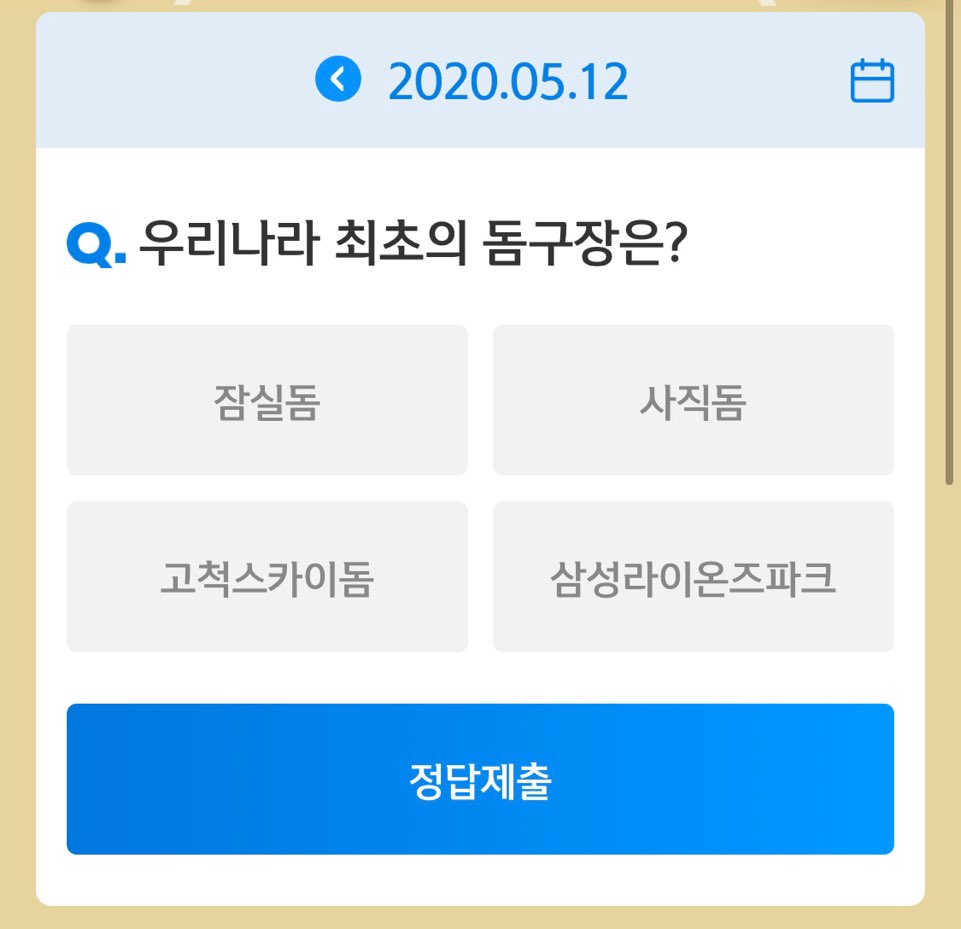 | [5/9(토) 쏠퀴즈] KBO리그 개막 기념으로 진행중인 [쏠야구 더블찬스] 이벤트는 몇일까지 진행될까요? (4) | 2020.05.09 |