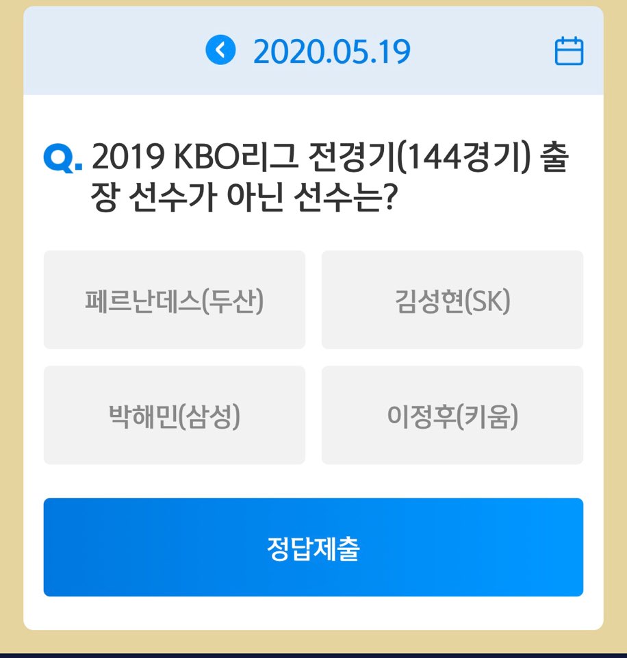 | [5/27(수) 쏠퀴즈] 다음 빈칸에 들어갈 숫자는? 2020신한은행 SOL KBO리그, 해외 OOO중계 서비스 확대 실시 (2) | 2020.05.27 |