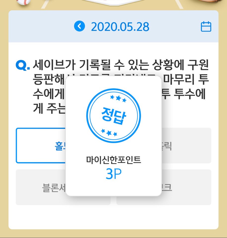 세이브가 기록될 수 있는 상황에 구원 등판해서 리드를 지켜내고, 마무리 투수에게 임무를 넘긴 중간계투 투수에게 주는 기록은?