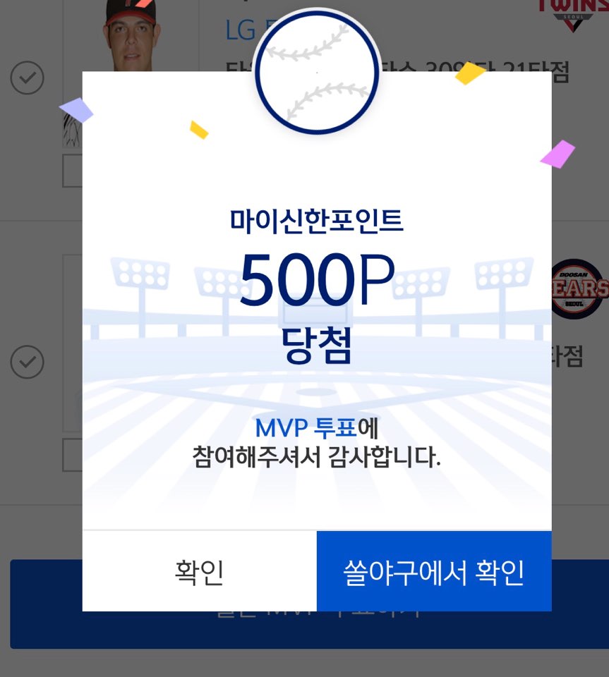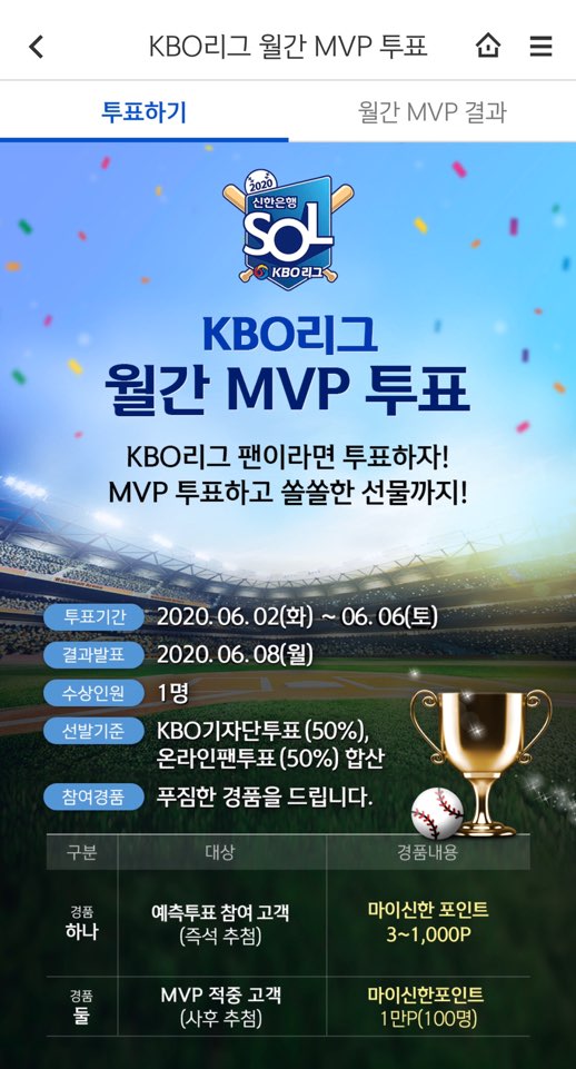 참여방법은 신한 쏠앱 - 쏠야구 - KBO리그 월간 MVP 투표 항목을 찾아서