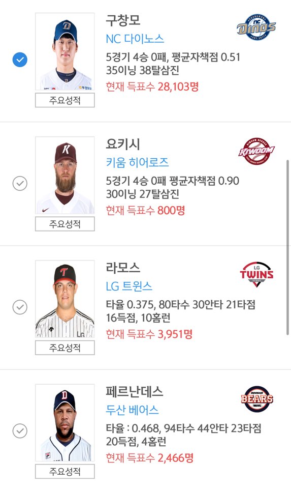 압도적인 1위를 달리고 있는 구창모선수에게 표를 나눠 줬습니다(삼성에게 2번이나 완패를 선물한 선수이기도 하죠)