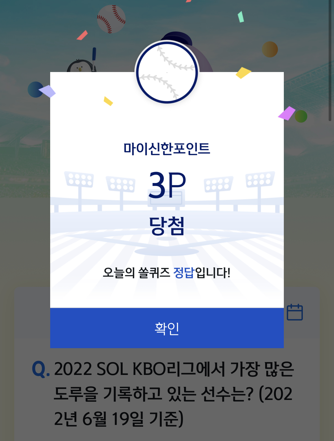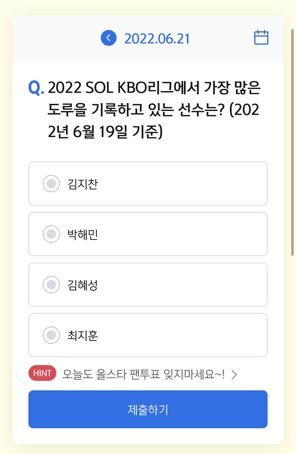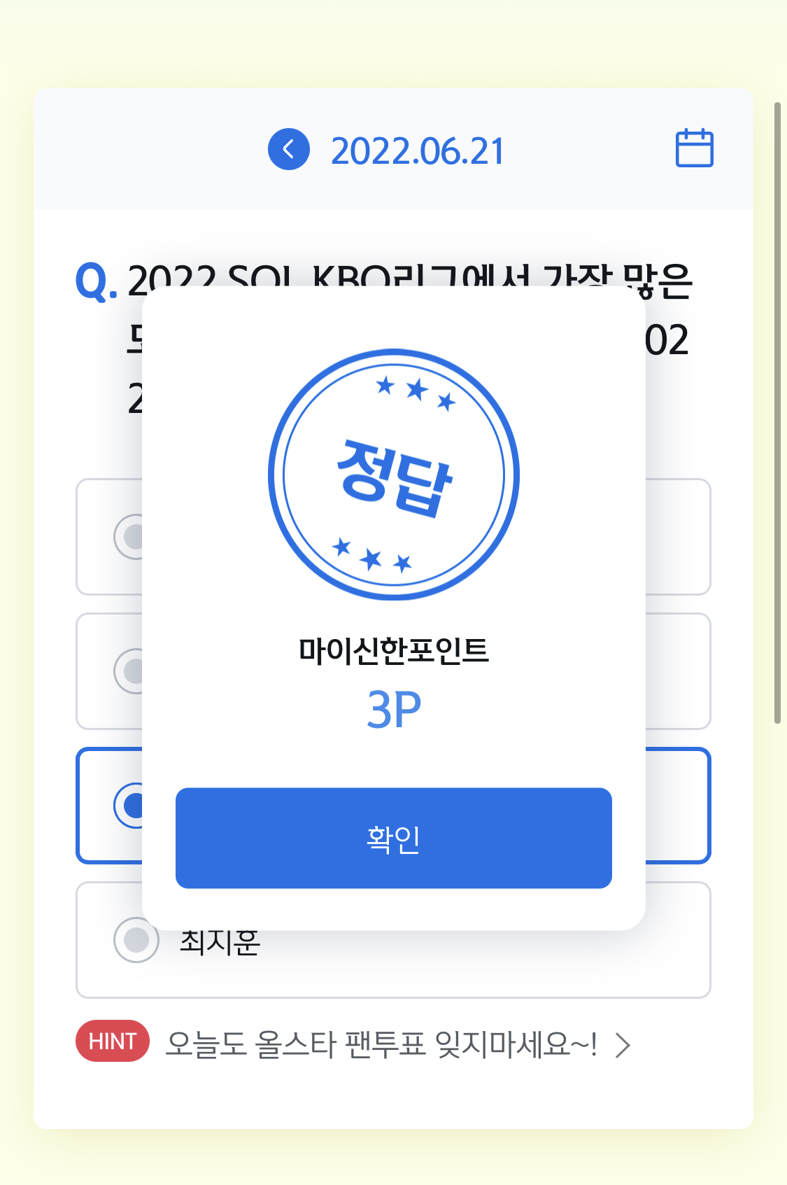 | 6월 20일 쏠퀴즈 : 2022 신한은행 SOL KBO 리그 5월 월간 MVP로 선정된 선수는? (0) | 2022.06.20 |