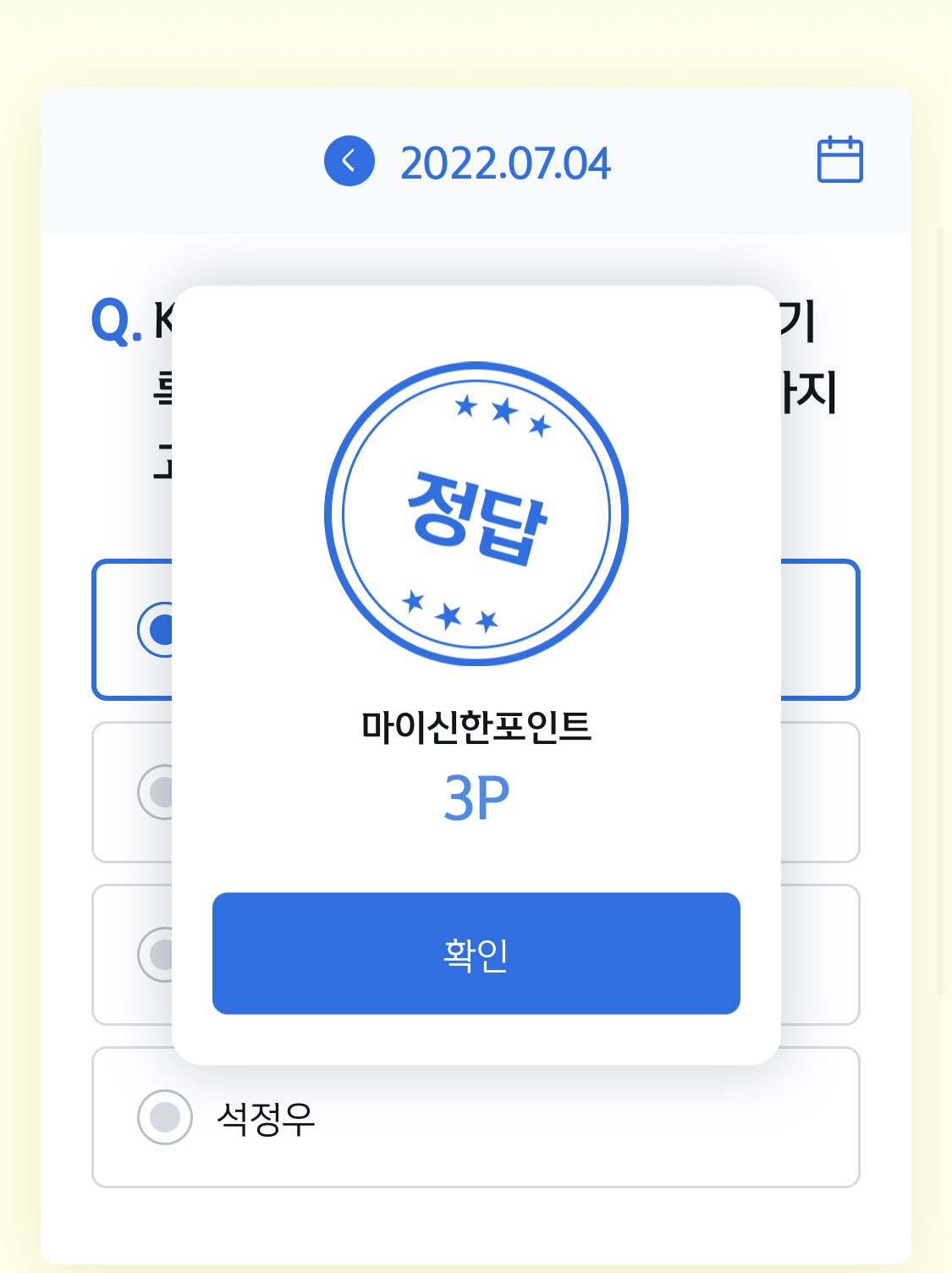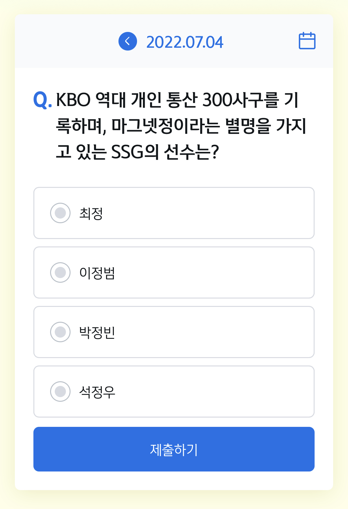 | 7월 6일 쏠 퀴즈 "2022 신한은행 SOL KBO 올스타 팬투표에서 팬투표 최다 득표를 얻은 선수는?" (1) | 2022.07.06 |