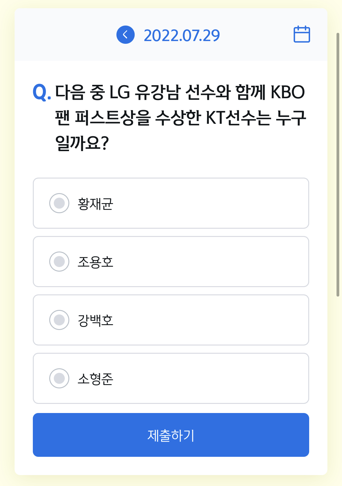 | 8월 10일 쏠 퀴즈 "2022 신한은행 SOL KBO리그 7월 월간 MVP의 선정된 선수는?" (0) | 2022.08.10 |