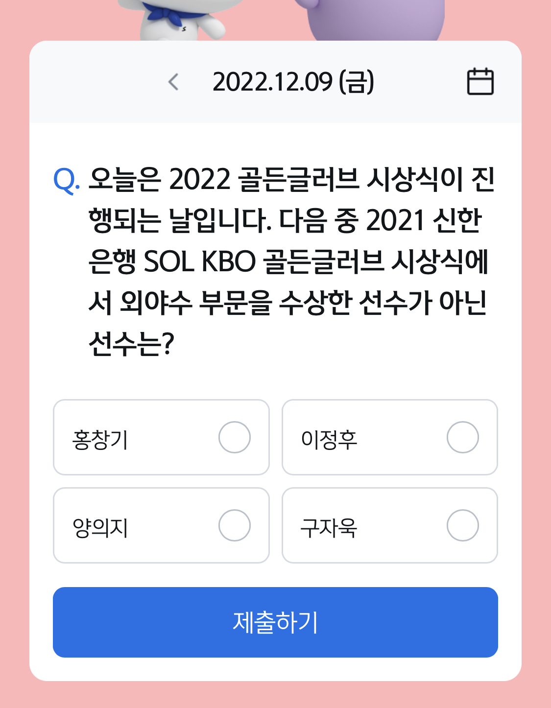 | 10월 30일 쏠퀴즈 현재 신한SOL 쏠야구에서 진행중인 2022 KBO 가을 야구 이벤트(타임세일존)의 추첨 경품이 아닌 것은? (0) | 2022.10.30 |