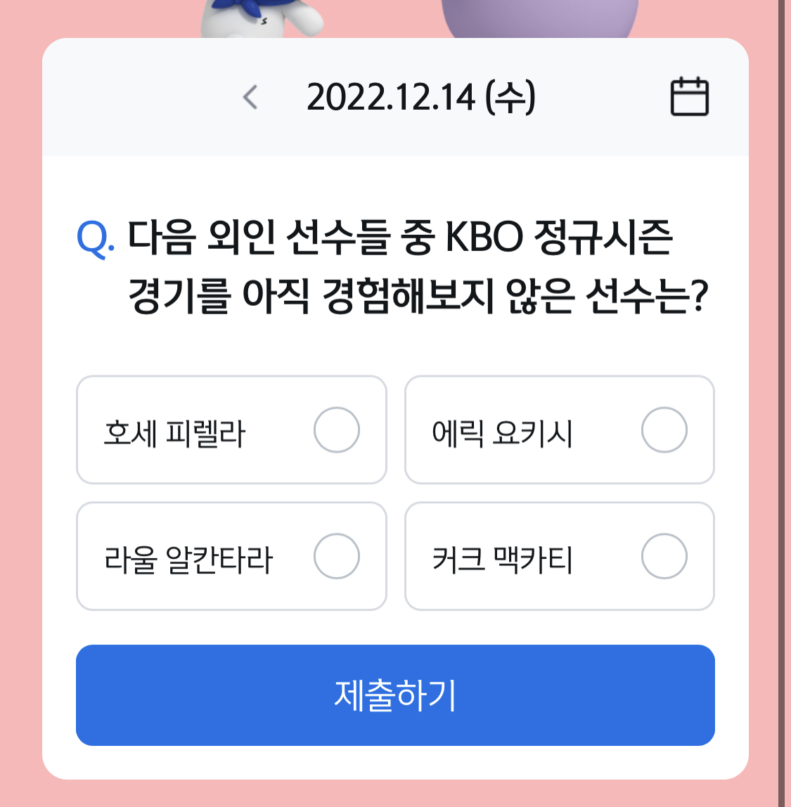 12월 14일 쏠퀴즈는 다음 외인 선수들 중 KBO 정규시즌 경기를 아직 경험해보지 않은 선수는?