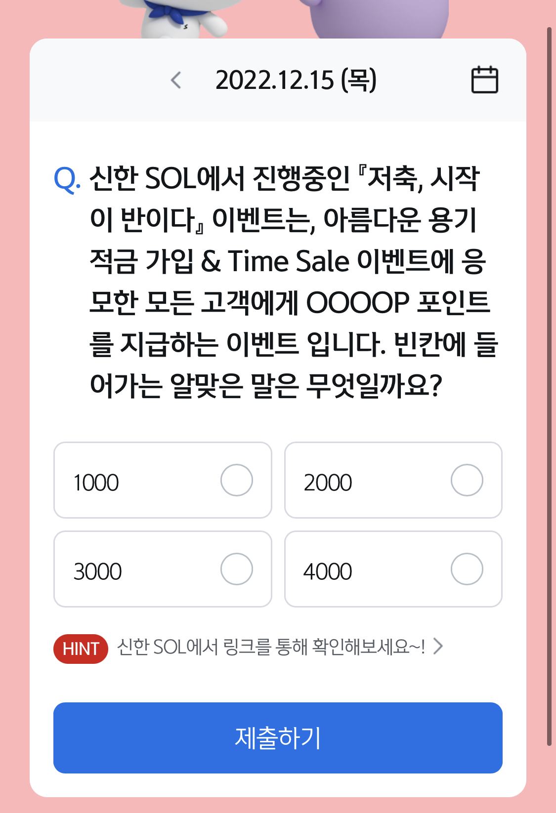 신한 SOL에서 진행중인 "저축, 시작이 반이다" 이벤트는, 아름다운 용기 적금 가입&Tome sale 이벤트에 응모한 모든 고객에게 OOOOP 포인트를 지급하는 이벤트입니다. 빈칸에 들어가는 알맞은 말은 무엇일까요?