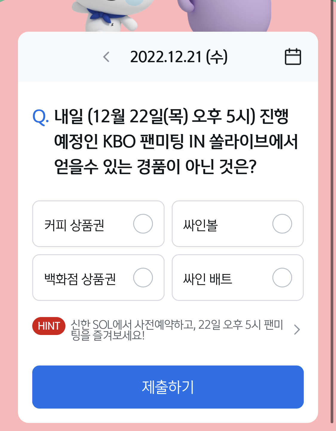 내일 12월 22일(목) 오후5시 진행 예정인 KBO 팬미팅 IN 쏠라이브에서 얻을 수 있는 경품이 아닌것은?