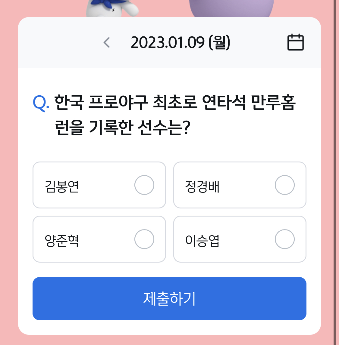 | 1월 11일 쏠퀴즈 다음 쿠수들 중, 주로 던지는 공이 좌완인 선수는?(현역 선수들 기준) (0) | 2023.01.11 |