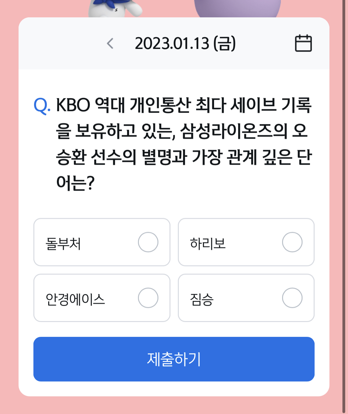 | 1월 11일 쏠퀴즈 다음 쿠수들 중, 주로 던지는 공이 좌완인 선수는?(현역 선수들 기준) (0) | 2023.01.11 |