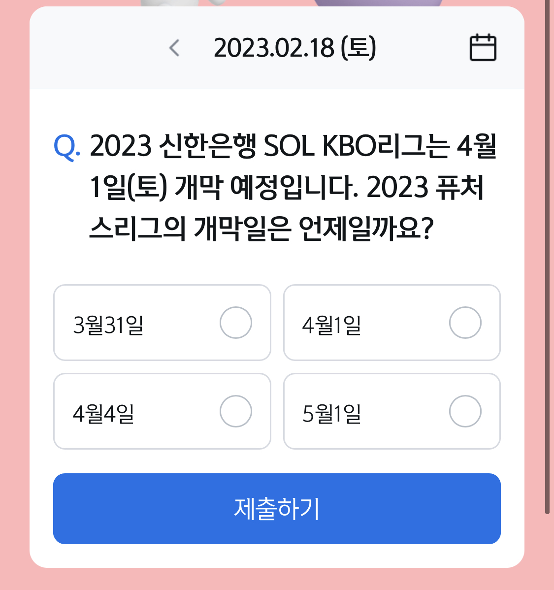 | 2월 17일 쏠퀴즈 2022 신한은행 SOL KBO리그 정규시즌에서 70승 이상을 기록한 팀은? (0) | 2023.02.17 |