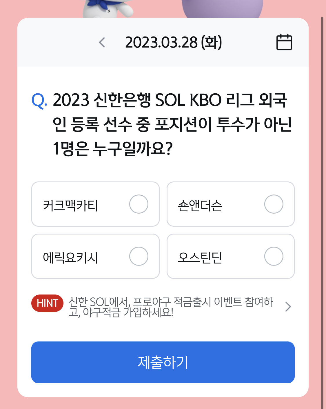 | 3월 27일 쏠퀴즈 2023 신한 프로야구 적금 우대금리를 받을 수 있는 쏠야구 컨텐츠 중, 적금 가입 응원 팀이 승리하면 다음날 포인트를 받 (0) | 2023.03.27 |
