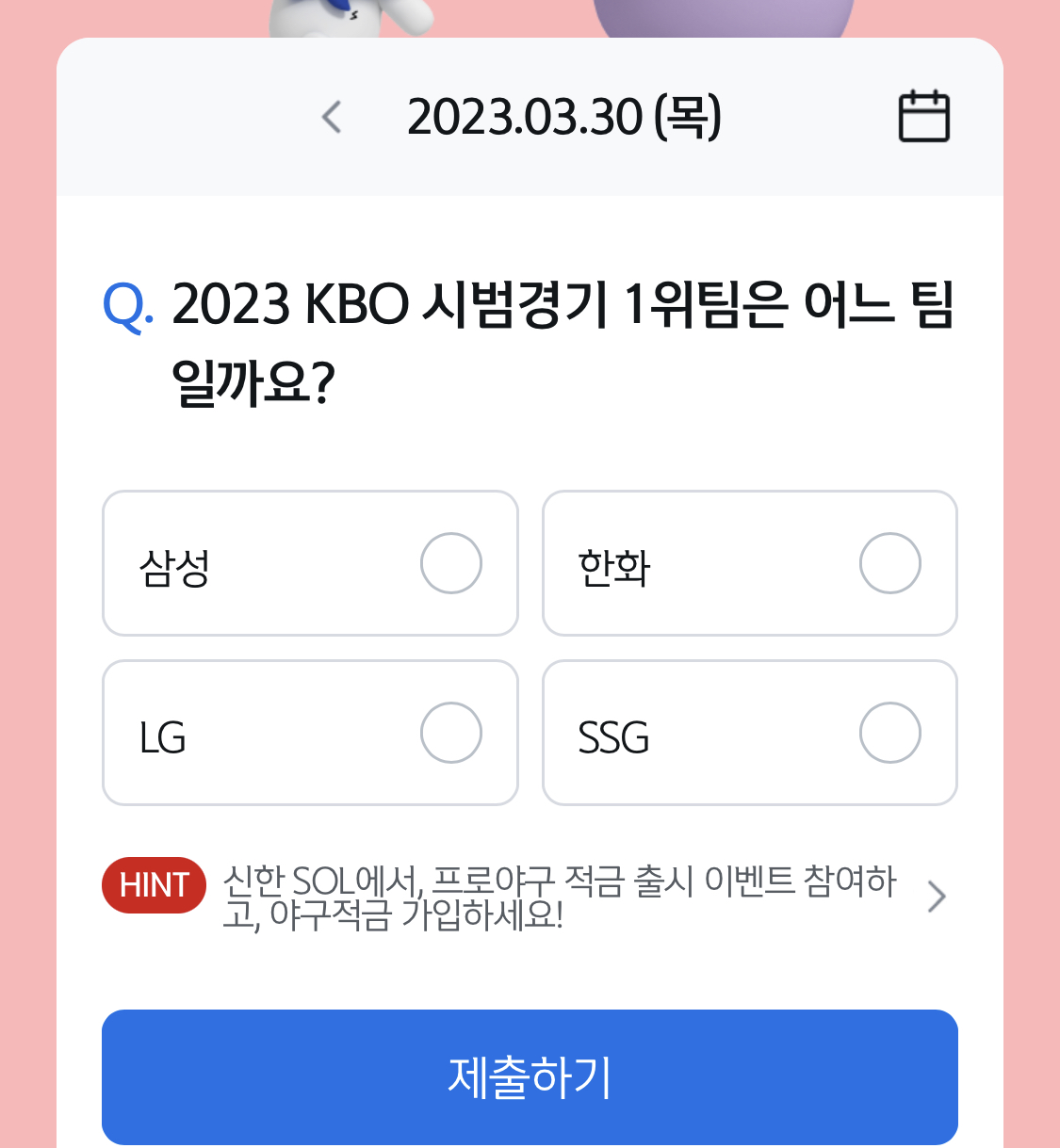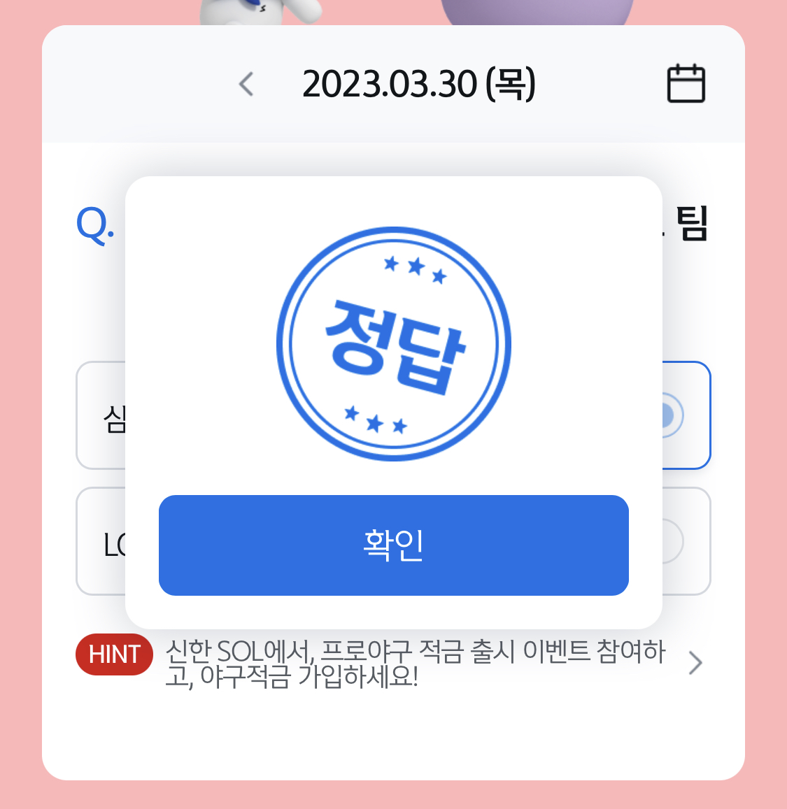 | 3월 27일 쏠퀴즈 2023 신한 프로야구 적금 우대금리를 받을 수 있는 쏠야구 컨텐츠 중, 적금 가입 응원 팀이 승리하면 다음날 포인트를 받 (0) | 2023.03.27 |